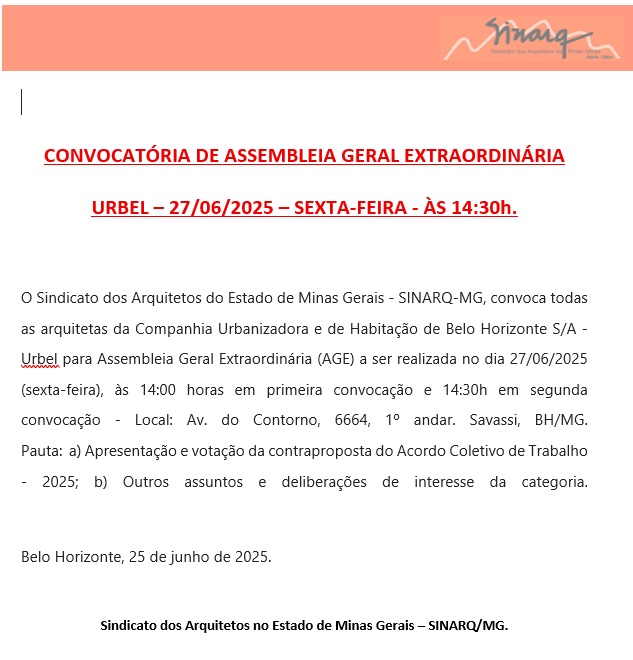 O Sindicato dos Arquitetos do Estado de Minas Gerais – SINARQ-MG, convoca todas as arquitetas da Companhia Urbanizadora e de Habitação de Belo Horizonte S/A – Urbel para Assembleia Geral Extraordinária (AGE) a ser realizada no dia 27/06/2025 (sexta-feira), às 14:00 horas em primeira convocação e 14:30h em segunda convocação – Local: Av. do Contorno, 6664, 1º andar. Savassi, BH/MG.