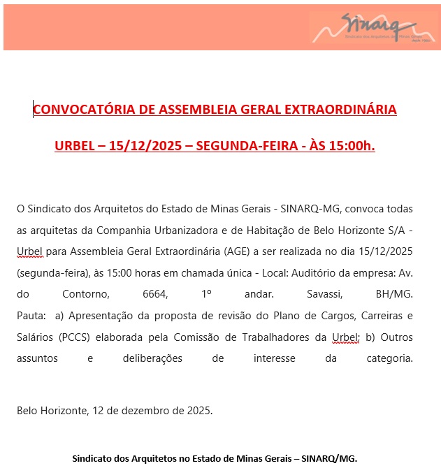 O Sindicato dos Arquitetos do Estado de Minas Gerais - SINARQ-MG, convoca todos os Arquitetos(as) empregados da MGS para Assembleia…