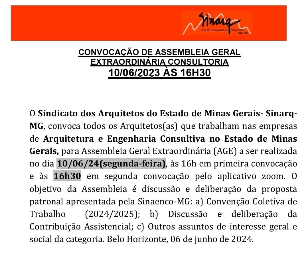 CONVOCAÇÃO DE ASSEMBLEIA GERAL EXTRAORDINÁRIA CONSULTORIA10/06/2023 - ÀS 16H30minO Sindicato dos Arquitetos do Estado de Minas Gerais- Sinarq-MG, convoca todos…